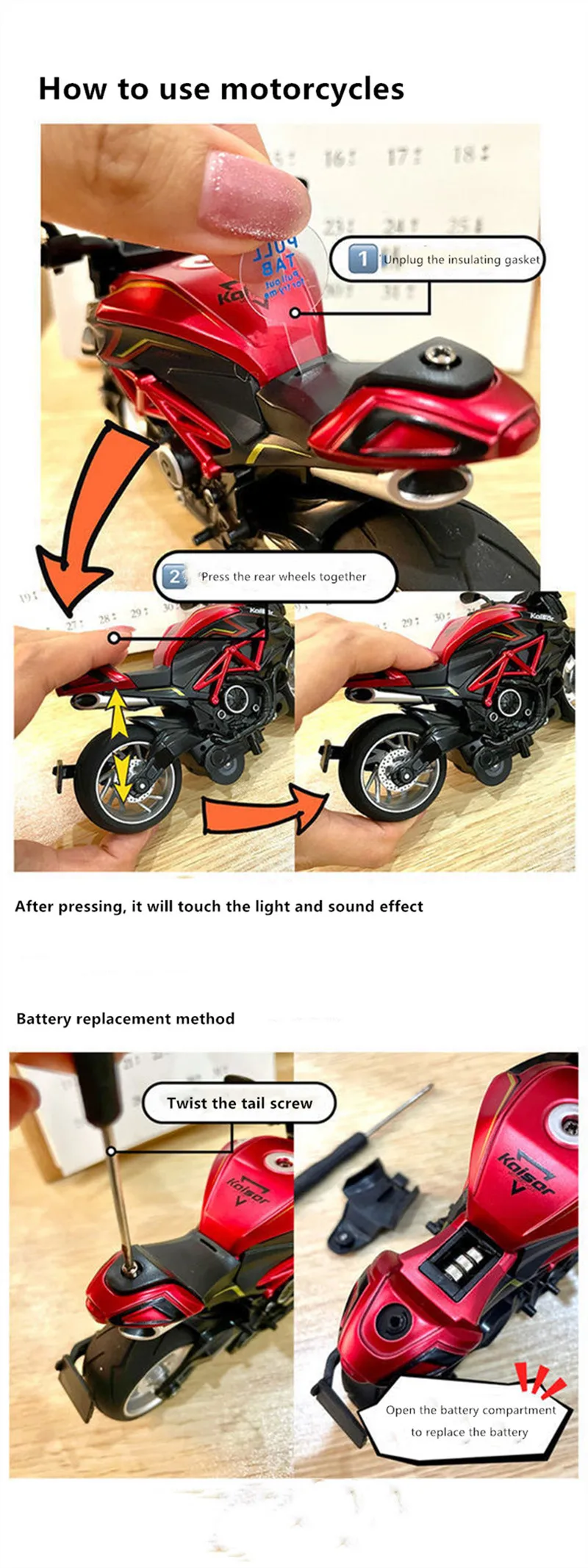 【How to use】Remove the insulating sheet at the rear of the car, press the car seat, there will be sound and light, press the body and pull it back, and then let go, the car will run forward