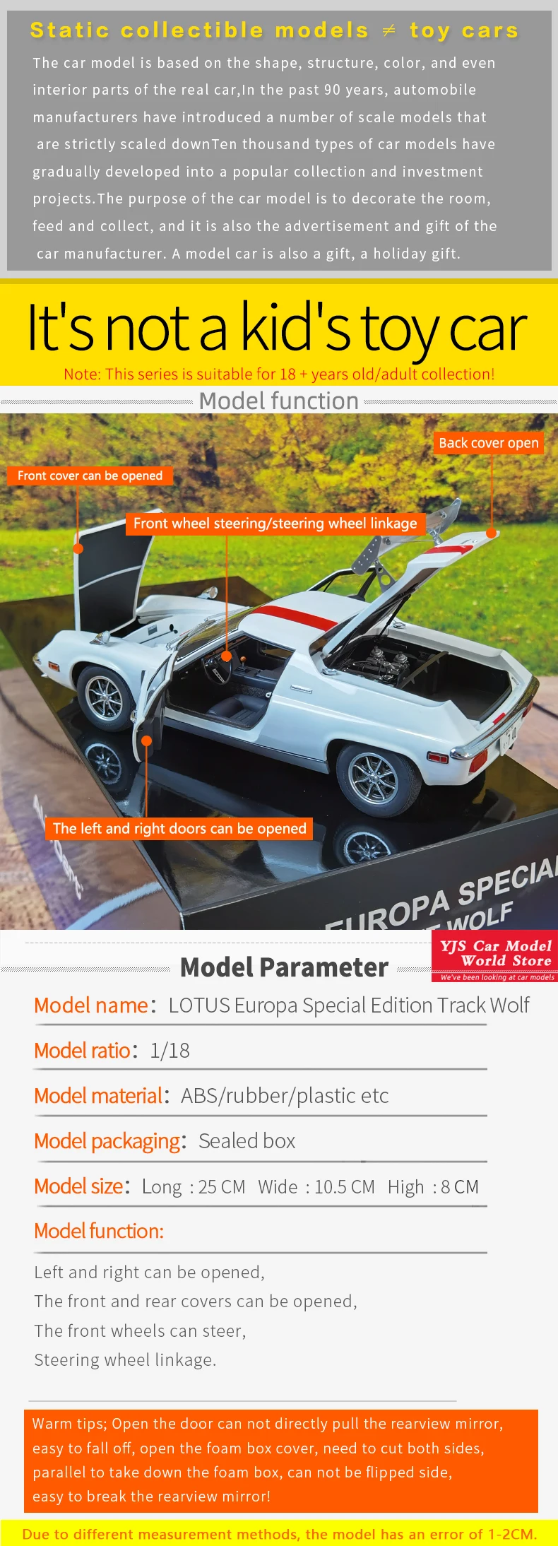 Tips: This is a static display model, not a toy car, not suitable for viewing collection under 14 years old.