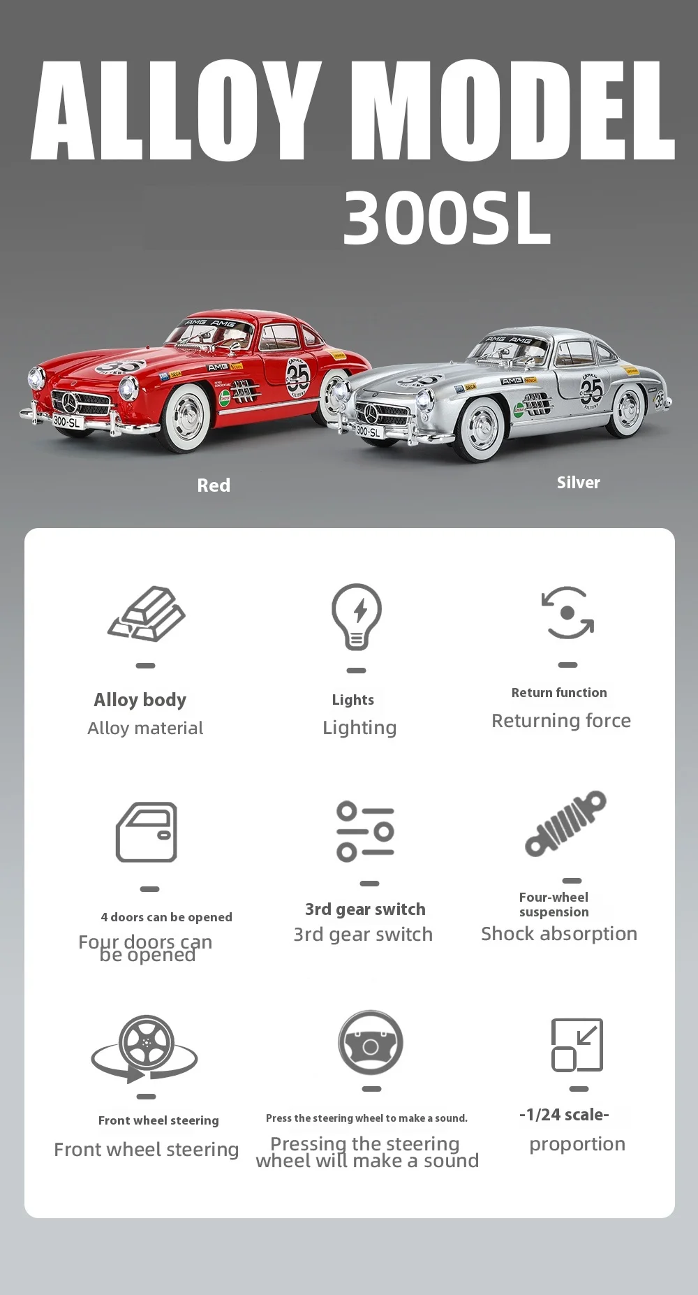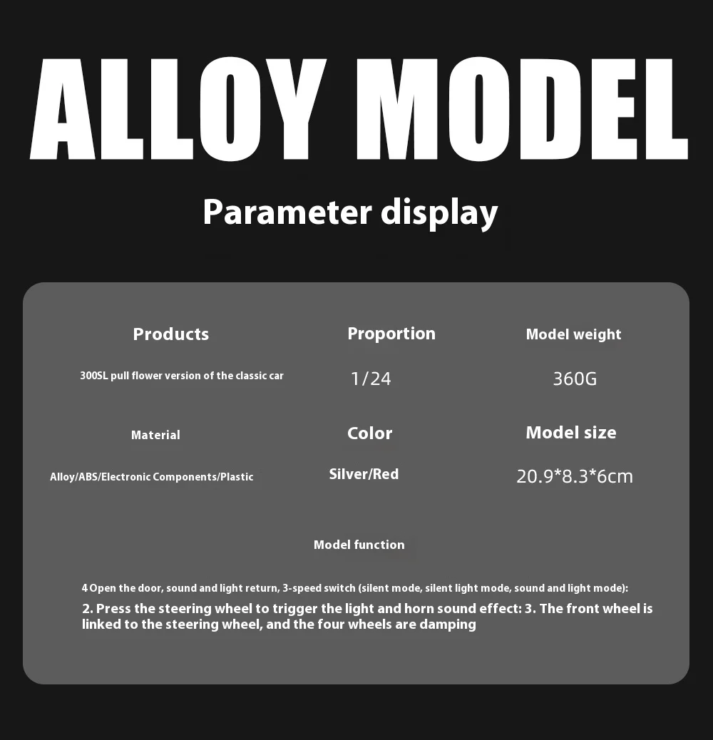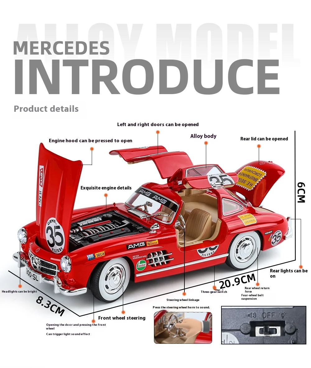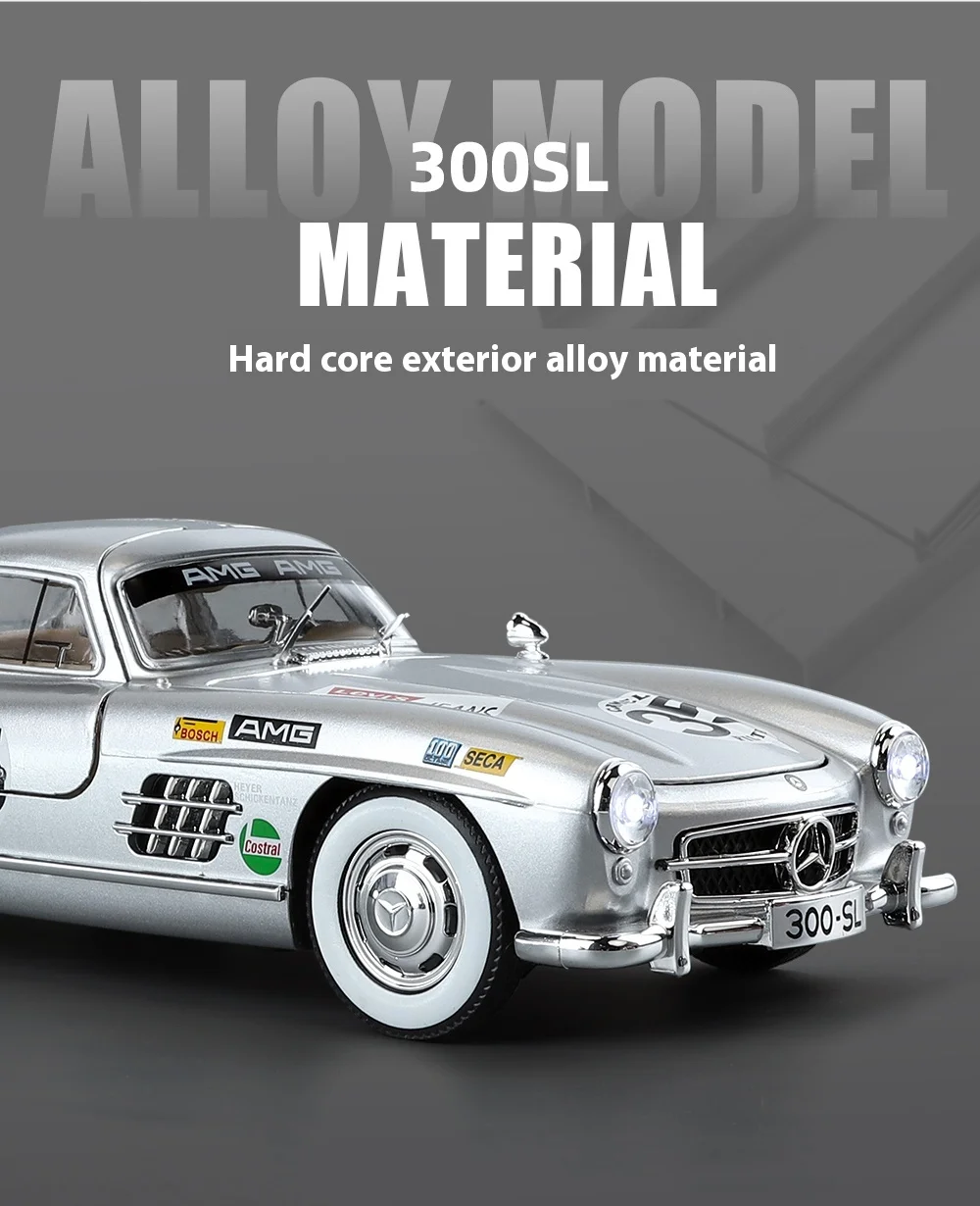 Perfect for Car Collectors: Whether your child is a budding car enthusiast or you're a collector yourself, this painted 300SL alloy car model is a must-have addition to any collection. Its exquisite detailing and authentic features make it a valuable piece that will be cherished for years to come.